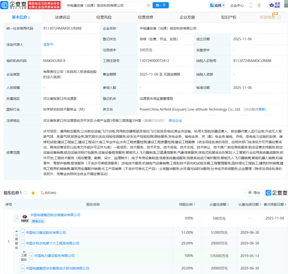 近日股票配资公司,中电建空港(沽源)低空科技有限公司成立,法定代表人为李梦平,经营范围包含:通用航空服务;公共航空运输;飞行训练;民用航空器驾驶员培训;飞行签派员培训等。企查查股权穿透显示,该公司由中国电建(601669)旗下中国电建集团航空港建设有限公司全资持股。
