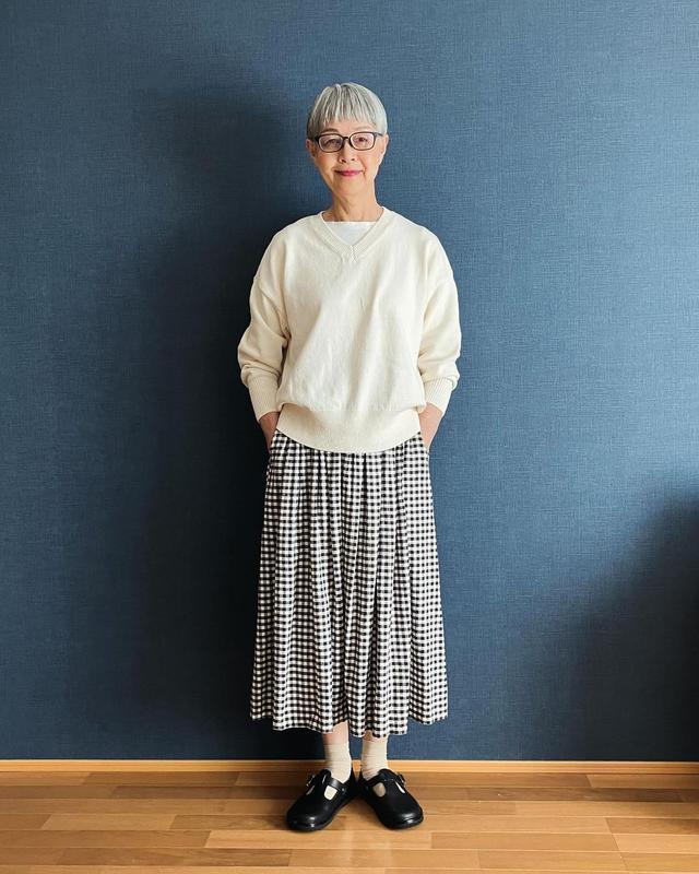 风格越简约,质感就要越高级,面料软而不塌的针织衫,搭配精梳棉格子裙,越看越耐看。
