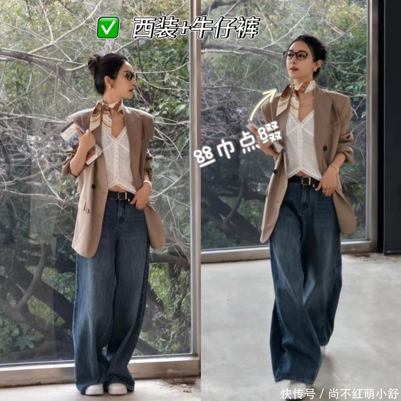 二、3个场合穿搭公式,大光明发型也能百变不重样薇娅示范1:职场通勤——大光明盘发+利落西装 +牛仔裤,干练到被老板夸“专业”