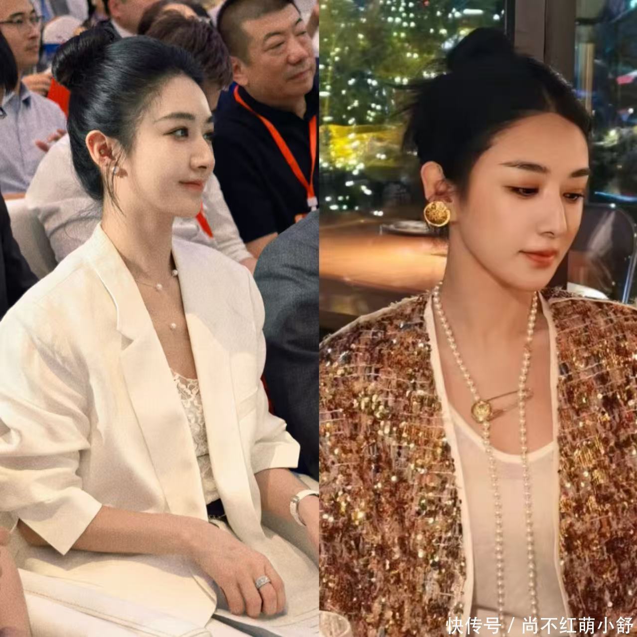 一身黑色抹胸裙+大光明盘发,高贵又气质;一套简约利落的米色套装+大光明盘发,金色配饰在耳间闪着光,愣是把“高智感”穿成了行走的教科书。