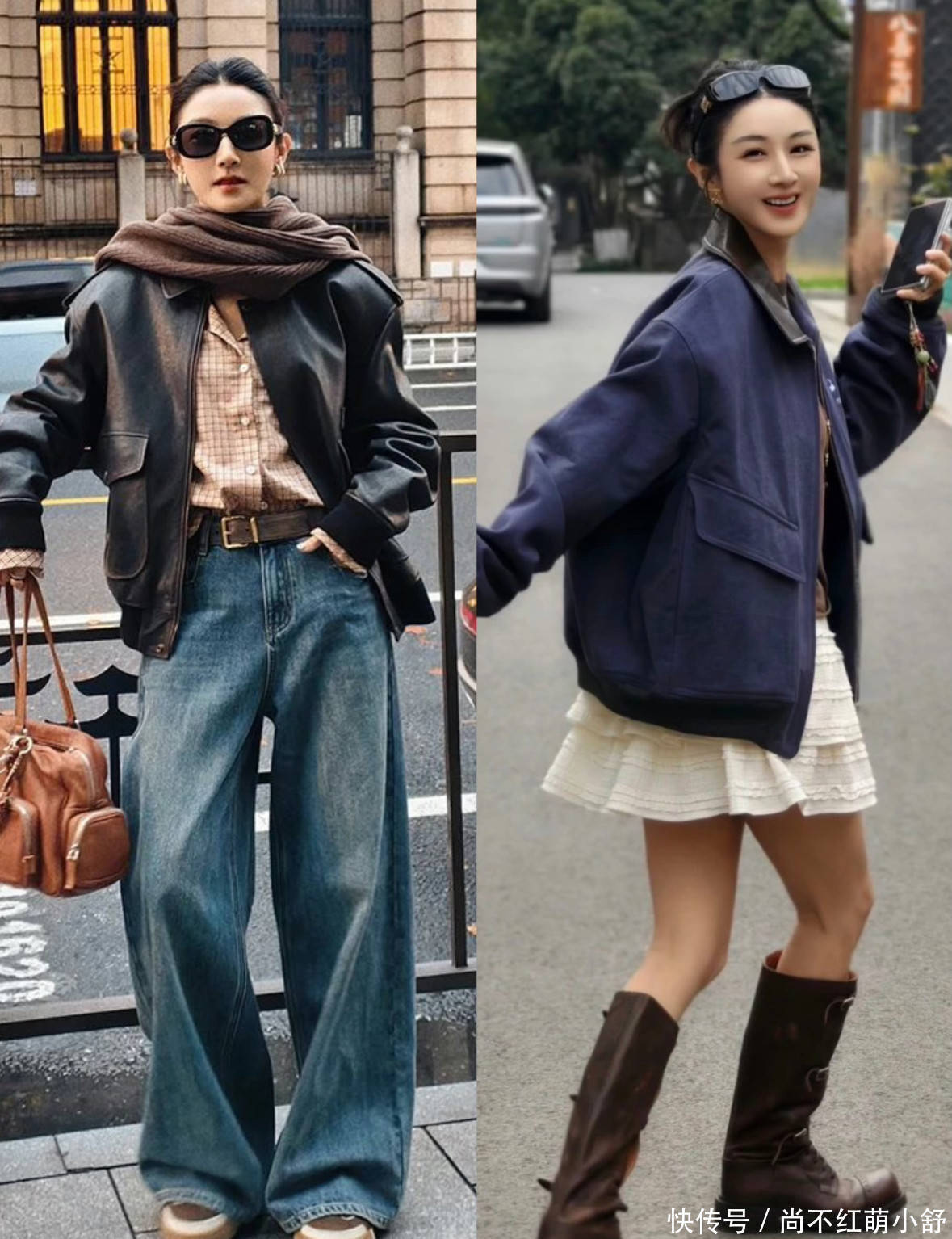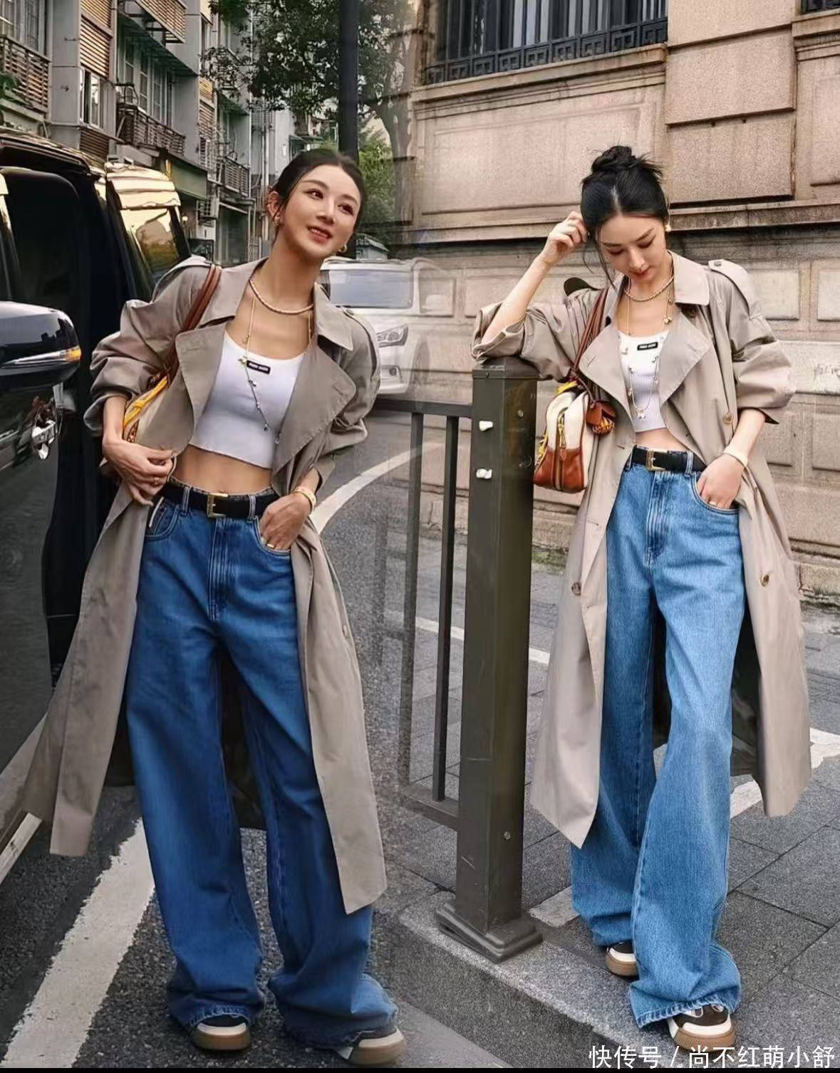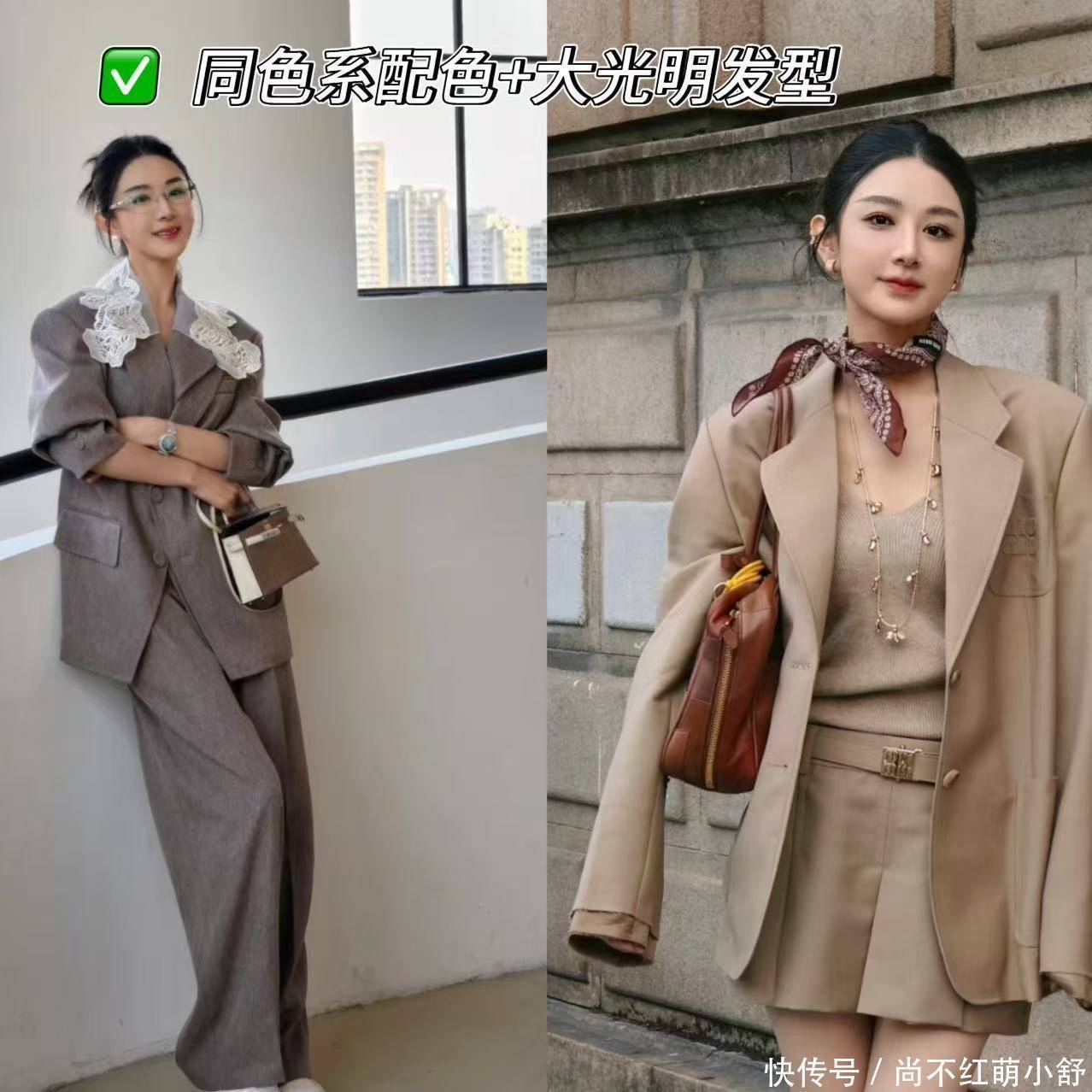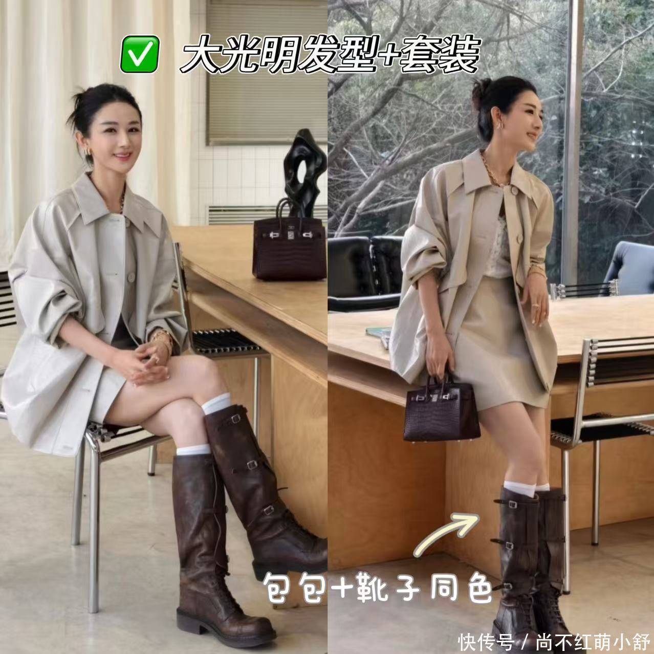 套装也是她私服里最常见的打扮,她这套衬衫风衣+半身裙,巧妙利用棕色的包包和靴子丰富色彩。再看她的发型,额前留两缕“龙须刘海”(长度到颧骨),既能修饰高额头,又带点少女感。
